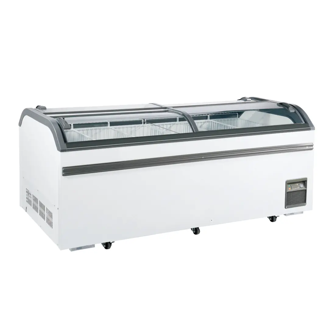 La congeladora vidrio curvo de 1008L CALVAC es ideal para la exhibición y conservación de productos refrigerados, helados u otros productos congelados. De fácil funcionamiento y limpieza. Es muy confiable y funcional. Su formato de isla permite ubicarla en medio de un pasillo para visualización en 360°.