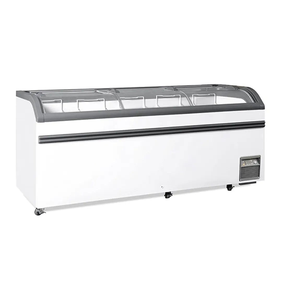 La estructura de la congeladora consiste en acero pre-pintado y tiene puertas de vidrio curvo templado, dos hojas de suave deslizamiento. El sistema de aislación es en base a Poliuretano de alta densidad.